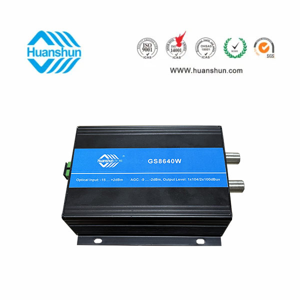 樓棟光接收機GS8640W 47~860MHz,-7~+2dBm/RF 1×106或2×102dBuv,電調輸出電平和斜率均衡,外置 90~255V-12V 1A 電源適配器